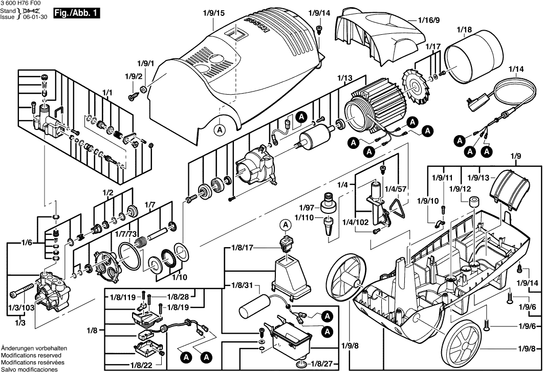 Aquí encontrará todas las piezas y dibujos técnicos disponibles de 'Bosch 3600H76F00 ( AQUATAK1200PLUS )'. Desde aquí podrá pedir todas las piezas deseadas directamente. Para muchas piezas de repuesto, es necesario pasar un pedido al fabricante. Dependiendo de la marca, el plazo de entrega puede variar entre una y cuatro semanas. Toda la información que tenemos está en nuestro sitio web. No podremos aconsejarle sobre lo que necesita hasta que entregue la máquina para su reparación. Tenga en cuenta lo siguiente a la hora de cursar su pedido: