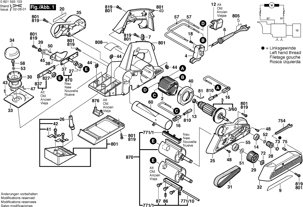 Aquí encontrará todas las piezas y dibujos técnicos disponibles de 'Bosch 0601593166 ( GHO31-82 )'. Desde aquí podrá pedir todas las piezas deseadas directamente. Para muchas piezas de repuesto, es necesario pasar un pedido al fabricante. Dependiendo de la marca, el plazo de entrega puede variar entre una y cuatro semanas. Toda la información que tenemos está en nuestro sitio web. No podremos aconsejarle sobre lo que necesita hasta que entregue la máquina para su reparación. Tenga en cuenta lo siguiente a la hora de cursar su pedido: