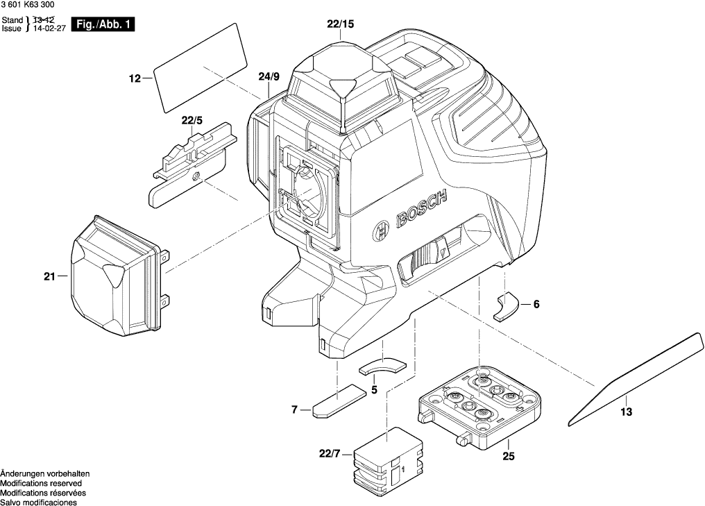Aquí encontrará todas las piezas y dibujos técnicos disponibles de 'Bosch 3601K63300 ( GLL3-80P )'. Desde aquí podrá pedir todas las piezas deseadas directamente. Para muchas piezas de repuesto, es necesario pasar un pedido al fabricante. Dependiendo de la marca, el plazo de entrega puede variar entre una y cuatro semanas. Toda la información que tenemos está en nuestro sitio web. No podremos aconsejarle sobre lo que necesita hasta que entregue la máquina para su reparación. Tenga en cuenta lo siguiente a la hora de cursar su pedido: