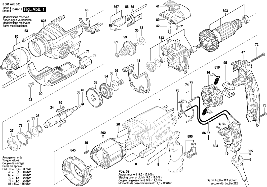 Lista de las piezas de repuesto de Bosch 3601A7B600 ( GSB19-2RE )