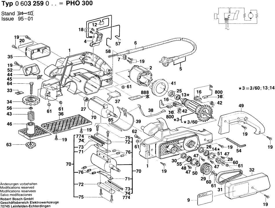 Aquí encontrará todas las piezas y dibujos técnicos disponibles de 'Bosch 0603259003 ( PHO300 )'. Desde aquí podrá pedir todas las piezas deseadas directamente. Para muchas piezas de repuesto, es necesario pasar un pedido al fabricante. Dependiendo de la marca, el plazo de entrega puede variar entre una y cuatro semanas. Toda la información que tenemos está en nuestro sitio web. No podremos aconsejarle sobre lo que necesita hasta que entregue la máquina para su reparación. Tenga en cuenta lo siguiente a la hora de cursar su pedido: