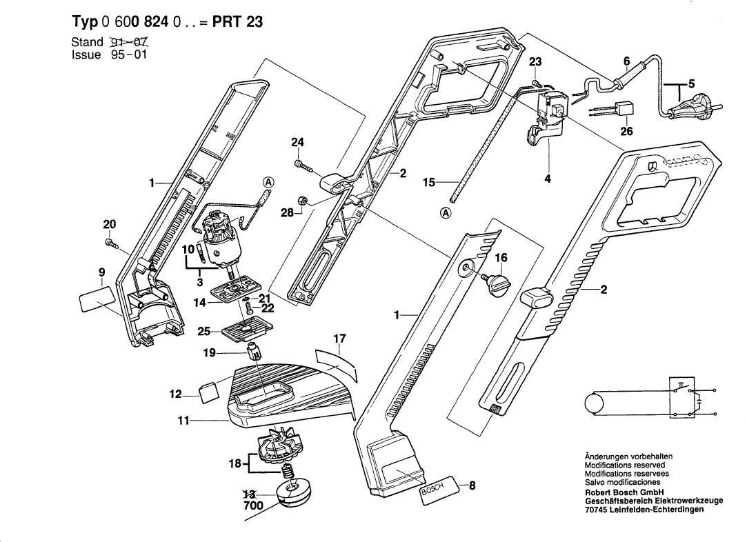 Aquí encontrará todas las piezas y dibujos técnicos disponibles de 'Bosch 0600824068 ( PRT23 )'. Desde aquí podrá pedir todas las piezas deseadas directamente. Para muchas piezas de repuesto, es necesario pasar un pedido al fabricante. Dependiendo de la marca, el plazo de entrega puede variar entre una y cuatro semanas. Toda la información que tenemos está en nuestro sitio web. No podremos aconsejarle sobre lo que necesita hasta que entregue la máquina para su reparación. Tenga en cuenta lo siguiente a la hora de cursar su pedido: