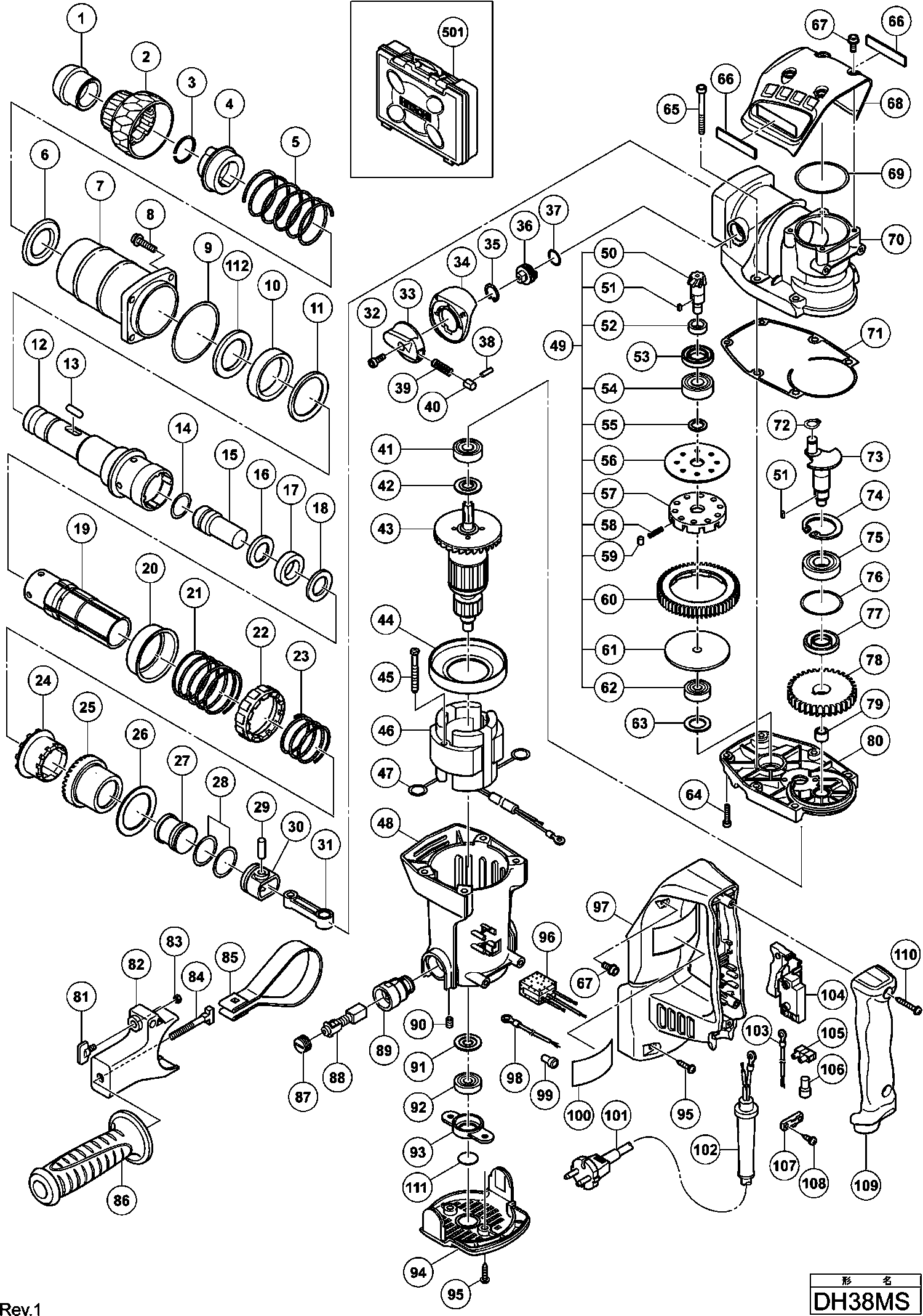 Aquí encontrará todas las piezas y dibujos técnicos disponibles de 'Hikoki DH38MS'. Desde aquí podrá pedir todas las piezas deseadas directamente. Para muchas piezas de repuesto, es necesario pasar un pedido al fabricante. Dependiendo de la marca, el plazo de entrega puede variar entre una y cuatro semanas. Toda la información que tenemos está en nuestro sitio web. No podremos aconsejarle sobre lo que necesita hasta que entregue la máquina para su reparación. Tenga en cuenta lo siguiente a la hora de cursar su pedido: