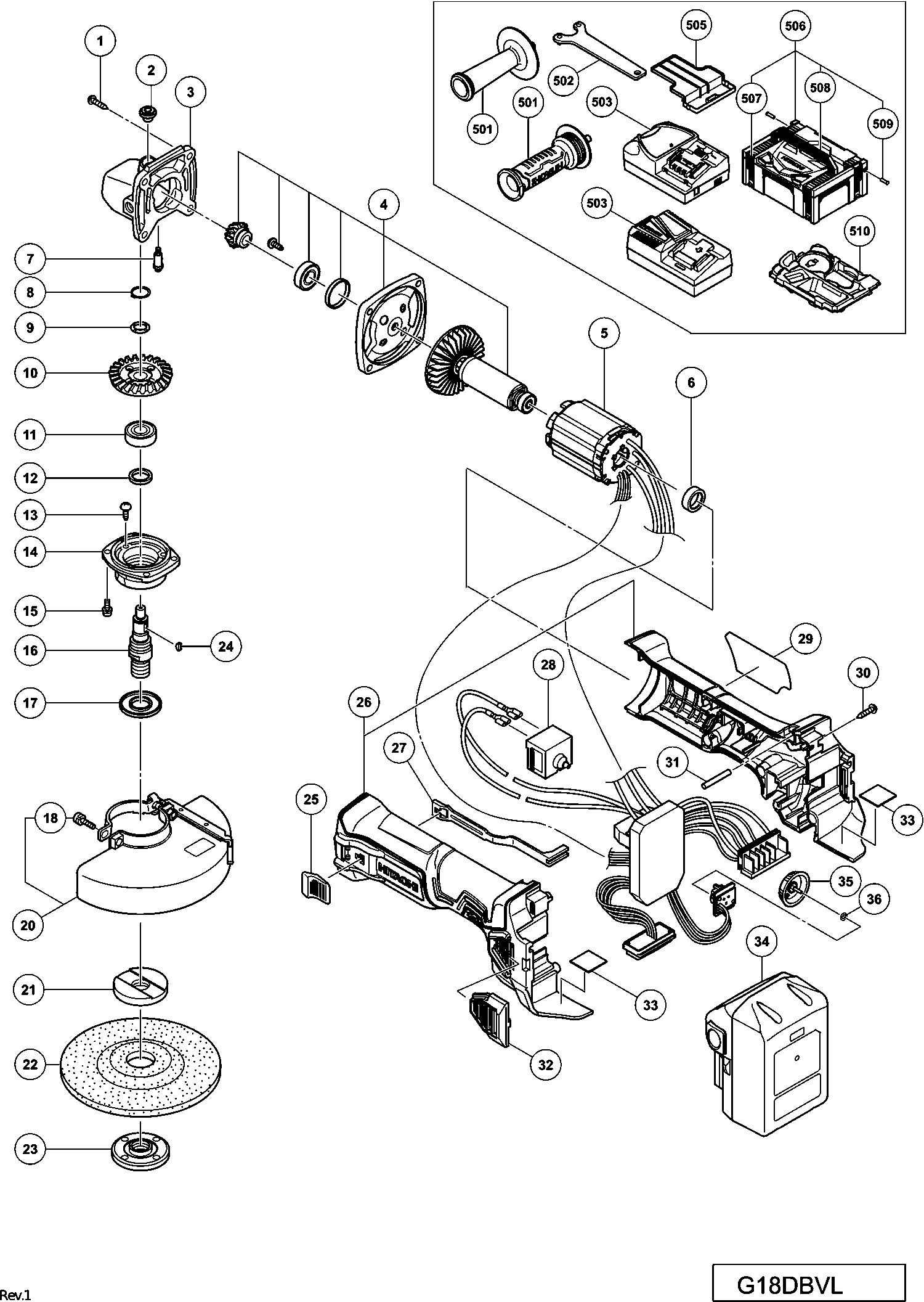 Lista de las piezas de repuesto de Hikoki G18DBVL
