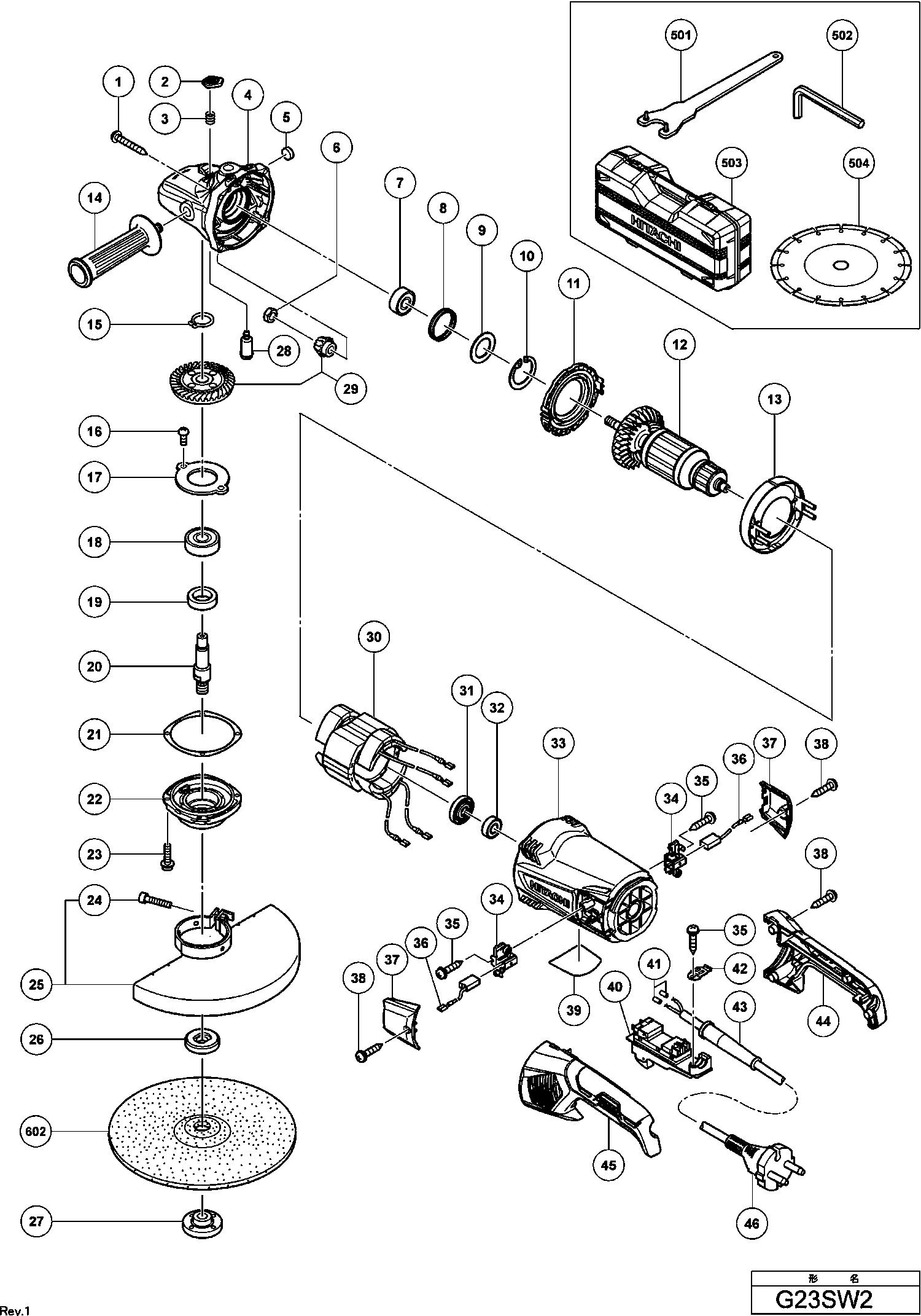 Aquí encontrará todas las piezas y dibujos técnicos disponibles de 'Hikoki G23SW2'. Desde aquí podrá pedir todas las piezas deseadas directamente. Para muchas piezas de repuesto, es necesario pasar un pedido al fabricante. Dependiendo de la marca, el plazo de entrega puede variar entre una y cuatro semanas. Toda la información que tenemos está en nuestro sitio web. No podremos aconsejarle sobre lo que necesita hasta que entregue la máquina para su reparación. Tenga en cuenta lo siguiente a la hora de cursar su pedido:
