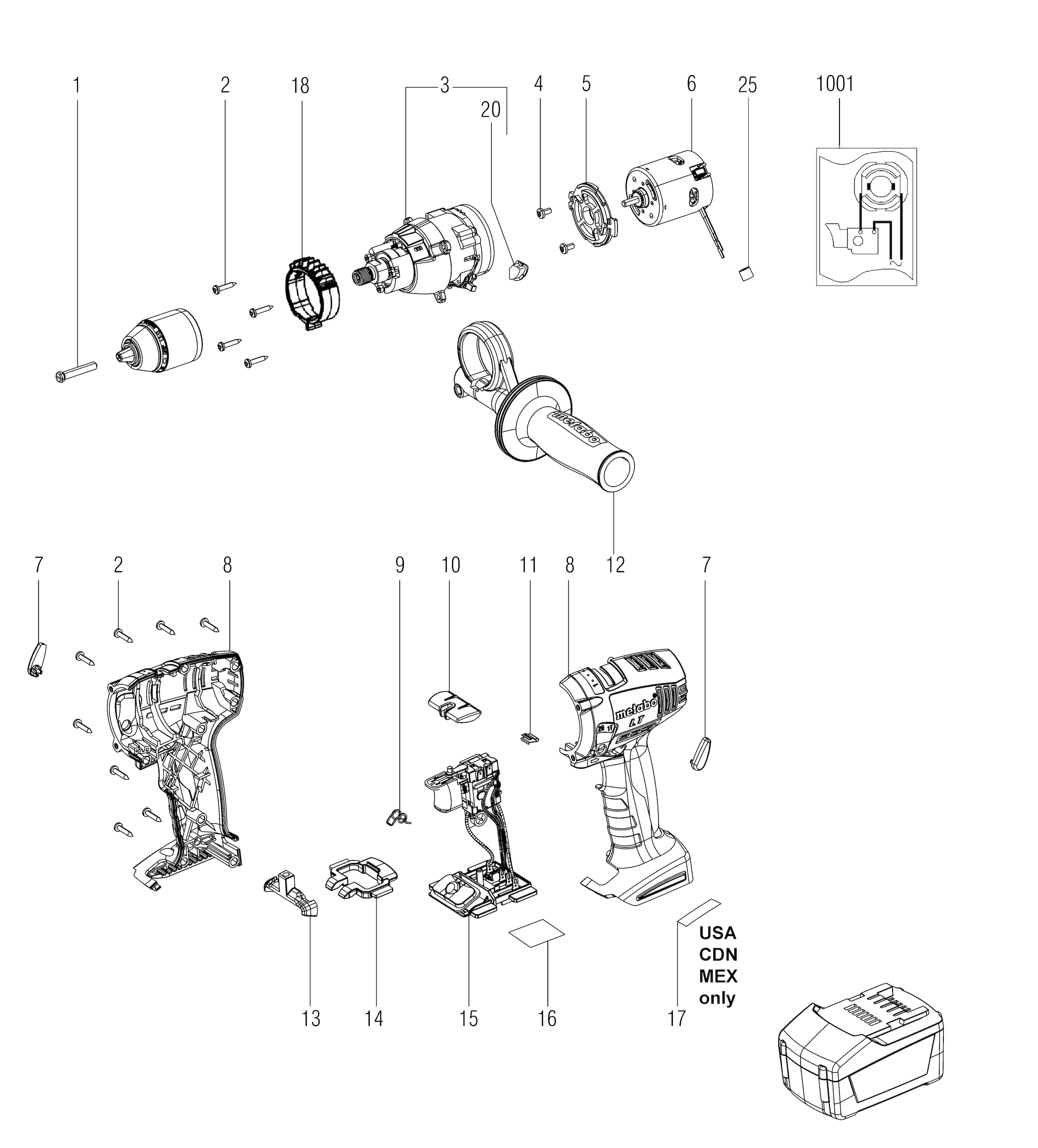 Aquí encontrará todas las piezas y dibujos técnicos disponibles de 'Metabo 02141001 ( SB18LT )'. Desde aquí podrá pedir todas las piezas deseadas directamente. Para muchas piezas de repuesto, es necesario pasar un pedido al fabricante. Dependiendo de la marca, el plazo de entrega puede variar entre una y cuatro semanas. Toda la información que tenemos está en nuestro sitio web. No podremos aconsejarle sobre lo que necesita hasta que entregue la máquina para su reparación. Tenga en cuenta lo siguiente a la hora de cursar su pedido: