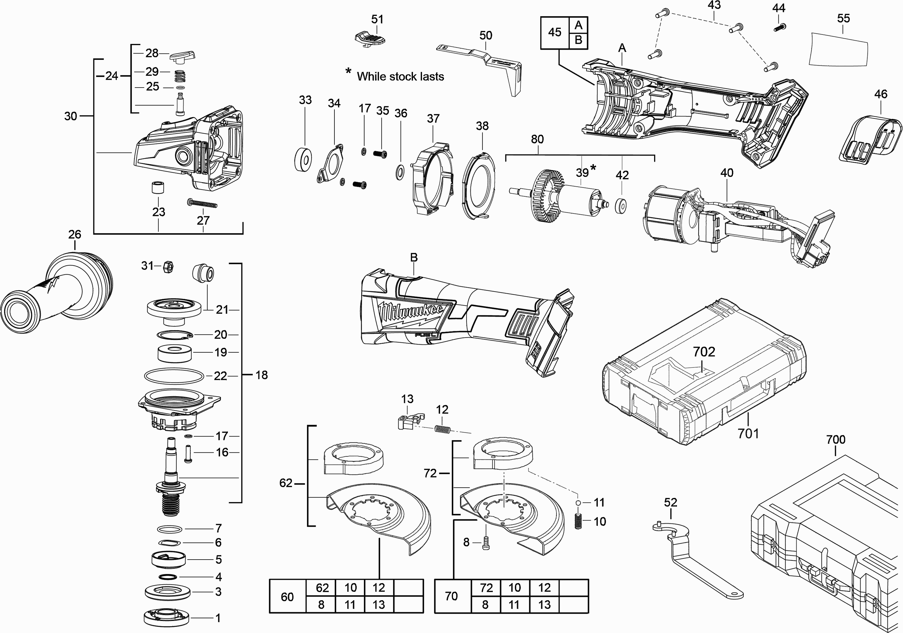 Aquí encontrará todas las piezas y dibujos técnicos disponibles de 'Milwaukee 4000443941 ( M18CAG125X0 )'. Desde aquí podrá pedir todas las piezas deseadas directamente. Para muchas piezas de repuesto, es necesario pasar un pedido al fabricante. Dependiendo de la marca, el plazo de entrega puede variar entre una y cuatro semanas. Toda la información que tenemos está en nuestro sitio web. No podremos aconsejarle sobre lo que necesita hasta que entregue la máquina para su reparación. Tenga en cuenta lo siguiente a la hora de cursar su pedido: