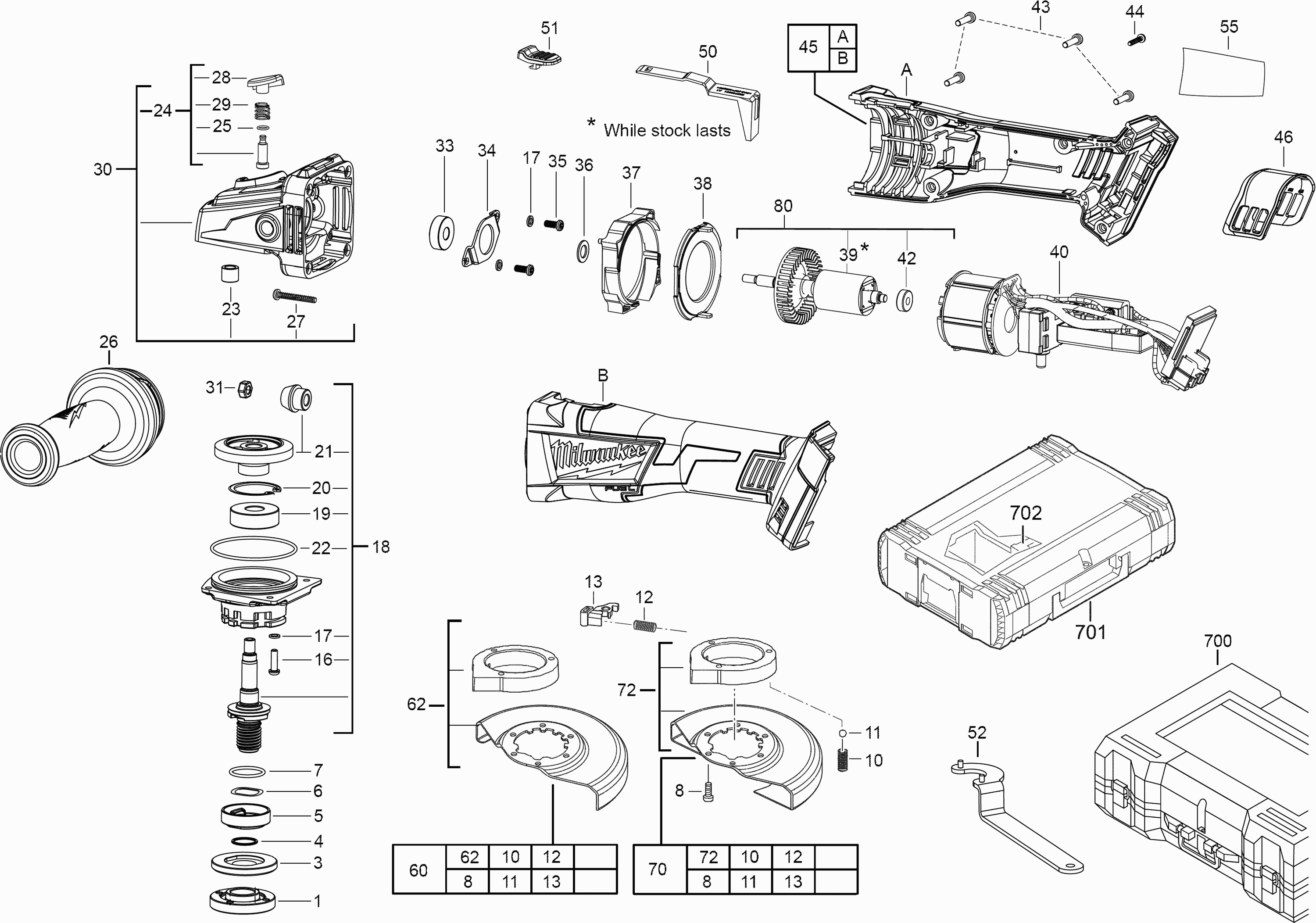 Aquí encontrará todas las piezas y dibujos técnicos disponibles de 'Milwaukee 4000458504 ( M18CAG125X0 )'. Desde aquí podrá pedir todas las piezas deseadas directamente. Para muchas piezas de repuesto, es necesario pasar un pedido al fabricante. Dependiendo de la marca, el plazo de entrega puede variar entre una y cuatro semanas. Toda la información que tenemos está en nuestro sitio web. No podremos aconsejarle sobre lo que necesita hasta que entregue la máquina para su reparación. Tenga en cuenta lo siguiente a la hora de cursar su pedido: